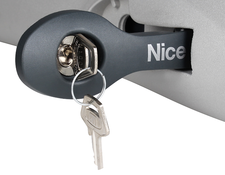 - wyposażony w wygodny mechanizm odblokowania awaryjnego w przypadku braku zasilania mechaniczny, który umożliwia otwieranie i zamykanie bramy w trybie ręcznym w przypadku braku prądu elektrycznego lub nieprawidłowego funkcjonowania bramy