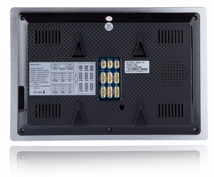 M901S to monitor z 7” kolorowym ekranem panoramicznym LCD o wysokiej rozdzielczości. Obsługuje 2 wejścia oraz 2 dodatkowe kamery CCTV. Korekcja obrazu jest dostępna osobno dla każdej z kamer. Monitor posiada funkcję pamięci zdjęć lub filmów z wizyt gości. Użytkownik może określić czy po naciśnięciu przycisku wybierania monitor zrobi zdjęcie czy nagra krótki klip. Całość zapisywana jest na karcie micro SD. Możliwość podpięcia czujnika alarmowego do każdej z kamer CCTV, który po zareagowaniu uruchamia ustaloną przez nas funkcję w monitorze – nagrywa film z tej kamery lub zapisuje zdjęcie. Dużym udogodnieniem jest funkcja sekwencyjnego podglądu ze wszystkich kamer, rozpoczęcia rozmowy i otwarcia elektrozaczepu bez konieczności wywołania z panelu zewnętrznego.
