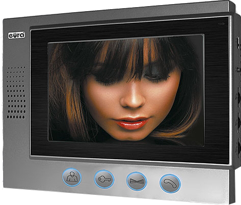 Monitor do wideodomofonu kolorowego, bezsłuchawkowy (głośnomówiący), z wyświetlaczem LCD 7″, sterowanie ryglem elektromagnetycznym, przycisk otwierania bramy wjazdowej, potencjometry głośności i wizji, możliwość rozbudowy o dodatkowe monitory, zasilacz prądu stałego, nowoczesne wzornictwo.
