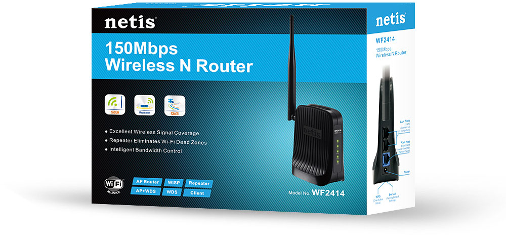 Router N150Mbps Netis WF2414 to ekonomiczne rozwiązanie dla aplikacji domowych i małych biur. Urządzenie jest kompatybilne z technologią 802.11b/g/n i oferuje transmisję danych bezprzewodowych do 150Mbps. Router może pracować w trybie AP, WDS, AP+WDS, Repeater, Client. Dzięki małej, zwartej konstrukcji idealnie nadaje się do wykorzystania jako Repeater. Multi SSID AP pozwala na stworzenie do czterech niezależnych sieci bezprzewodowych dla „rodziny” i „gości”. Wbudowany QoS pozwala na kontrolę przepływu pakietów, z możliwością ustawienia minimalnych bądź maksymalnych wartości dla poszczególnych komputerów, co pozwala na łatwą optymalizację łącza. Dzięki dołączonej płycie CD i funkcji WPS konfiguracja jest bardzo prosta.