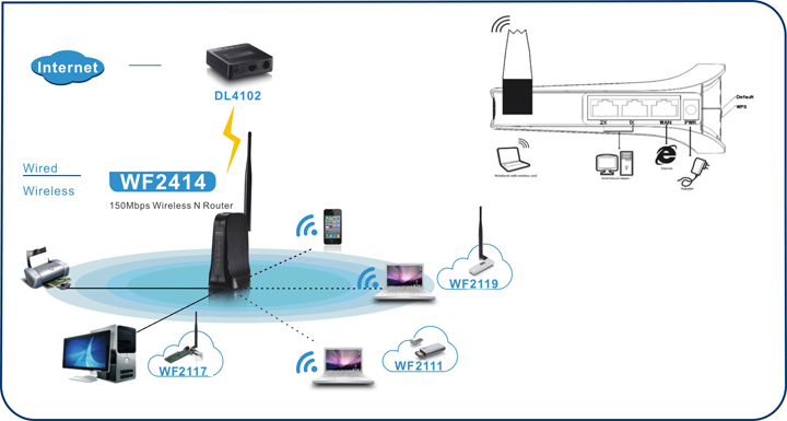 Dzięki pracy w standardzie IEEE 802.11n, urządzenie WF2414 umożliwia zestawienie połączenia bezprzewodowego, które jest kilkukrotnie szybsze i pokrywa sygnałem większy obszar w porównaniu do produktów działających w standardzie IEEE 802.11g. Transmisja danych z prędkością 150Mb/s zapewnia dużą wydajność umożliwiając wygodne surfowanie po Internecie, współdzielenie plików, transfer multimedialny i komunikację głosową