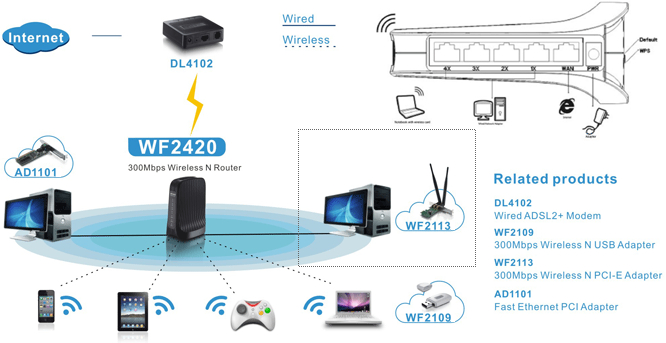 Dzięki pracy w standardzie IEEE 802.11n, router WF2420 umożliwia zestawienie połączenia bezprzewodowego, które w porównaniu do produktów działających w standardzie 11g jest 15 razy szybsze i pokrywa sygnałem 5 krotnie większy obszar. Bezprzewodowa prędkość przesyłu danych wynosi do 300Mb/s.
