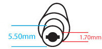 - Typ wtyczki: Średnica zewnętrzna 5.5 mm, średnica wewnętrzna 1.7 mm, długość bolca w zasilaczu 12 mm