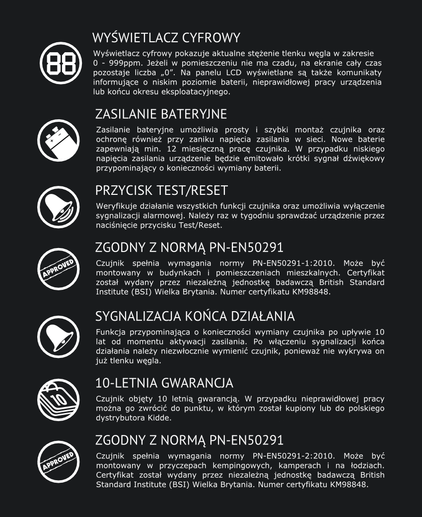 End – koniec okresu działania czujnikaPrzycisk Test/Reset do kontroli i obsługi urządzenia. Po naciśnięciu przycisku urządzenie przeprowadza test kontrolny, a w przypadku aktywacji alarmu umożliwia jego wyłączenie Przycisk stężenia szczytowego Po naciśnięci przycisku wyświetlany jest najwyższy wykryty poziom CO od momentu wyzerowania pamięci detektora Czasy aktywacji alarmu progi alarmowe zgodnie z PN-EN 50291-1:2010 30 PPM brak alarmu przed upływem 120 min. 50 PPM musi zaalarmować w ciągu 60-90 min. 100 PPM musi zaalarmować w ciągu 10-40 min. 300 PPM musi zaalarmować w ciągu 3 min Certyfikaty i dopuszczenia PN-EN 50291-1 2010, certyfikat dopuszczający do użytku mieszkaniach i domach PN-EN 50291-2 2010, certyfikat dopuszczający do użytku w przyczepach kempingowych, kamperach i łodziach deklaracja CE Gwarancja 10 lat