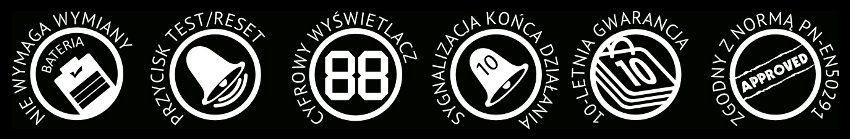 End – koniec okresu działania czujnikaPrzycisk Test/Reset do kontroli i obsługi urządzenia. Po naciśnięciu przycisku urządzenie przeprowadza test kontrolny, a w przypadku aktywacji alarmu umożliwia jego wyłączenie Pamięć wartości szczytowych Po naciśnięci przycisku wyświetlany jest najwyższy wykryty poziom CO od momentu wyzerowania pamięci detektora Czasy aktywacji alarmu progi alarmowe zgodnie z PN-EN 50291-1:2010 30 PPM brak alarmu przed upływem 120 min. 50 PPM musi zaalarmować w ciągu 60-90 min. 100 PPM musi zaalarmować w ciągu 10-40 min. 300 PPM musi zaalarmować w ciągu 3 min Certyfikaty i dopuszczenia PN-EN 50291-1 2010, jednostka certyfikująca BSI deklaracja CE Gwarancja 10 lat łącznie z baterią